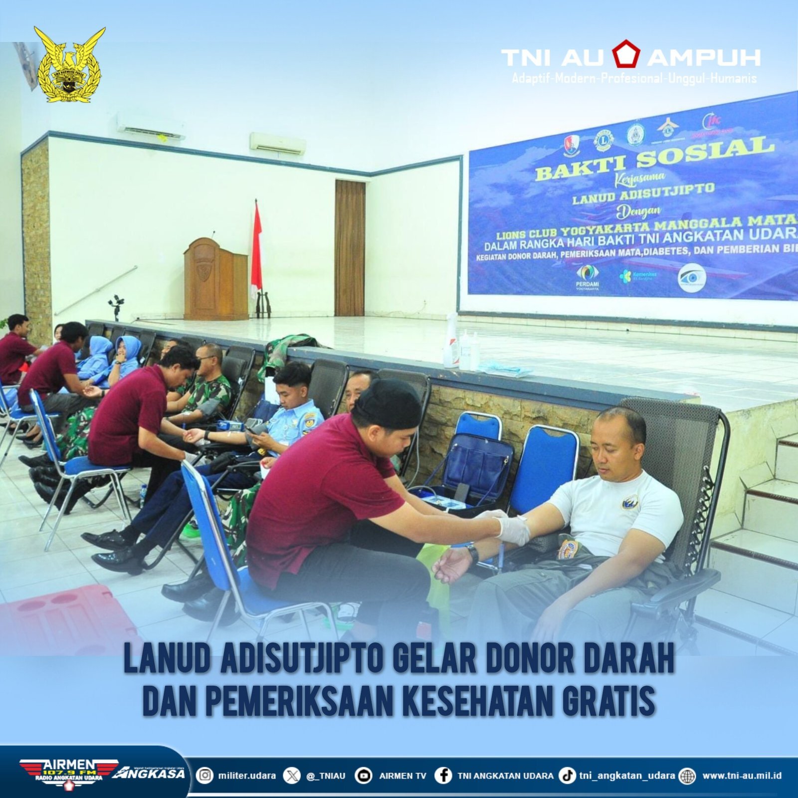Memperingati Hari Bakti TNI AU ke-78, Lanud Adisutjipto menggelar bakti sosial berupa donor darah dan pemeriksaan kesehatan gratis di Gedung Serba Guna Adisutjipto, Yogyakarta, Rabu (31/7/2025).