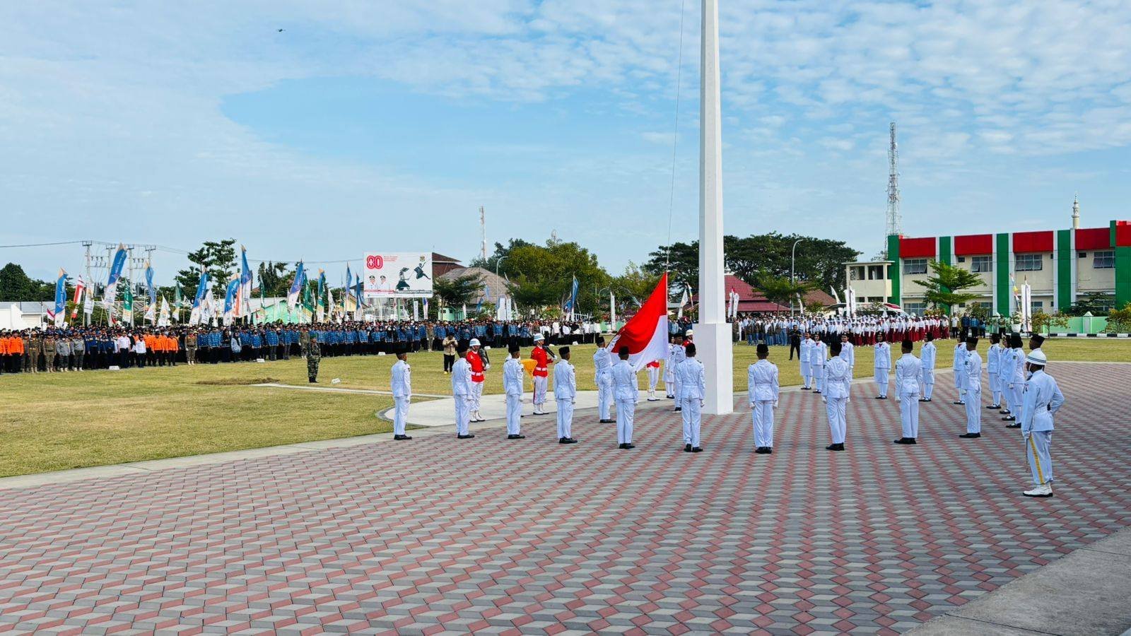 Sementara itu, di Lapangan Kantor Bupati Lombok Barat, upacara berlangsung dengan khidmat di bawah pimpinan Bupati H. Lalu Ahmad Zaini sebagai inspektur upacara.