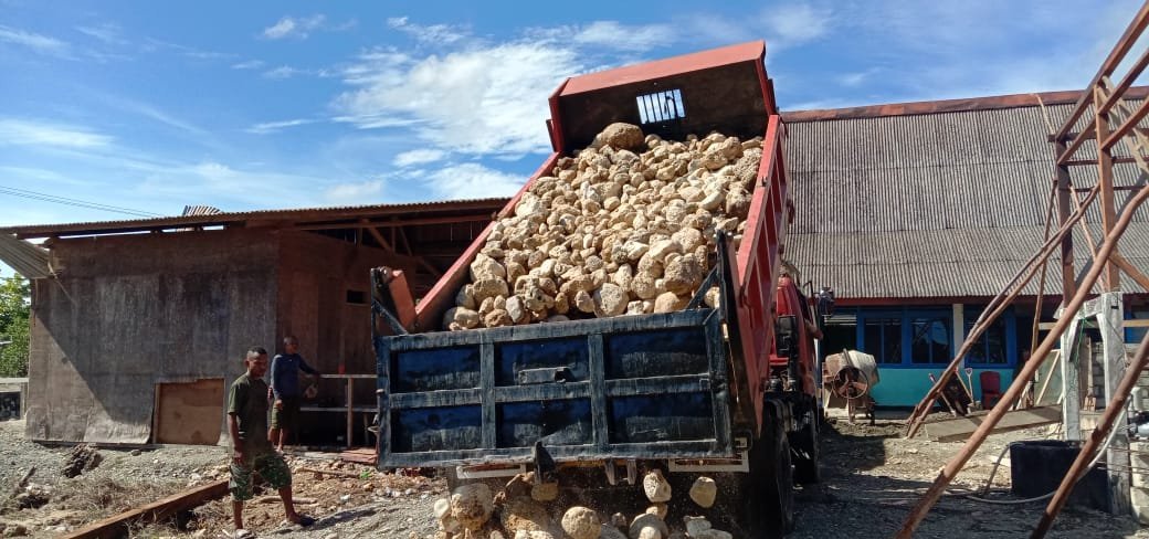Danramil 1705-02/Napan, Lettu Inf La Samute, yang turut mengawasi distribusi material, menyampaikan bahwa proses pekerjaan fisik akan segera memasuki tahap pondasi setelah seluruh material dasar seperti batu, pasir, dan semen tersedia di lokasi.
