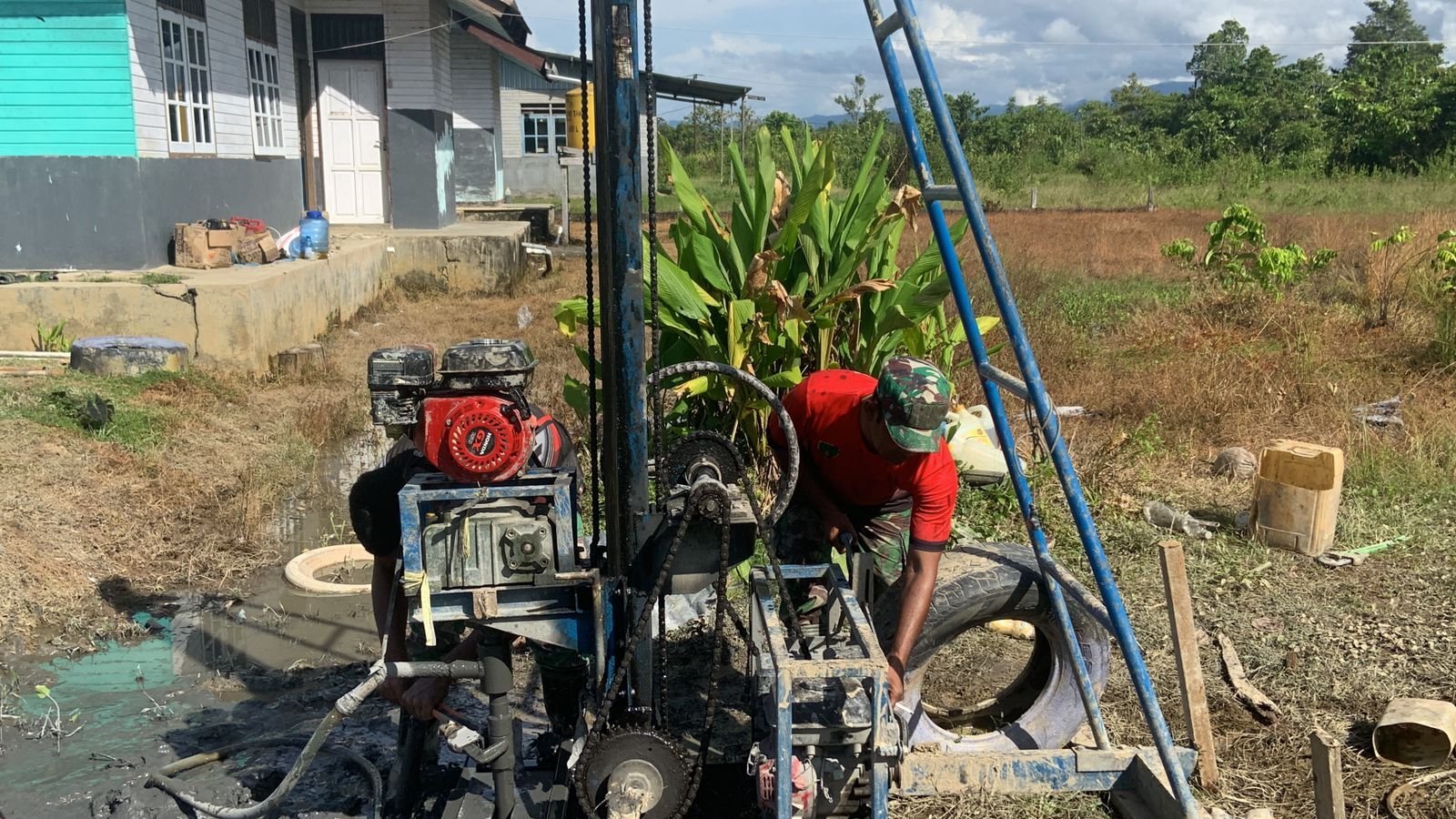 Nabire, 6 Agustus 2025 — Pekerjaan pembangunan sumur bor program Manunggal Air Bersih sebagai bagian dari TMMD ke-125 Kodim 1705/Nabire di Kampung Manunggal Jaya, Distrik Makimi, terus berlanjut meski terkendala medan berat dan sulitnya mendapatkan sumber air.