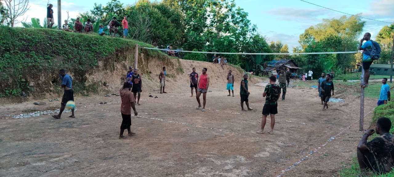Suasana sore itu terasa begitu hangat. Anggota Satgas TMMD berbaur dengan warga, tokoh masyarakat, dan para pemuda Waropko dalam pertandingan voli yang berlangsung penuh tawa dan sorak semangat. Meski lapangan yang digunakan sederhana dengan tanah merah khas Papua, antusiasme warga terlihat begitu tinggi.