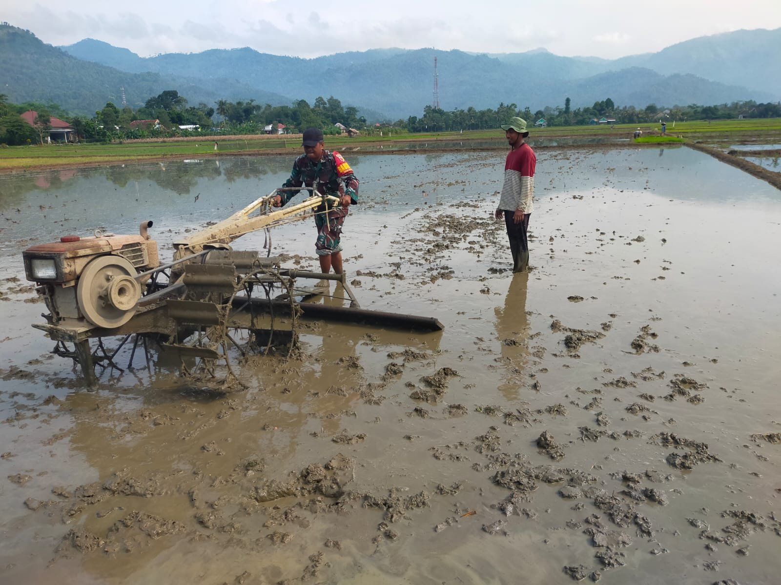 Lumajang, Babinsa Tempursari Koramil 0821-18/Tempursari Peltu, Dwi Hasim As’ari, bersama aparat terkait dan petani setempat melaksanakan pendampingan ketahanan pangan melalui pembajakan lahan miliki oleh Sujatmiko, anggota Kelompok Tani Karya Tani II di Dusun Krajan, Desa Tempursari, Kecamatan Tempursari, Kabupaten Lumajang, Jawa Timur.. pada Rabu (26/2/2025).