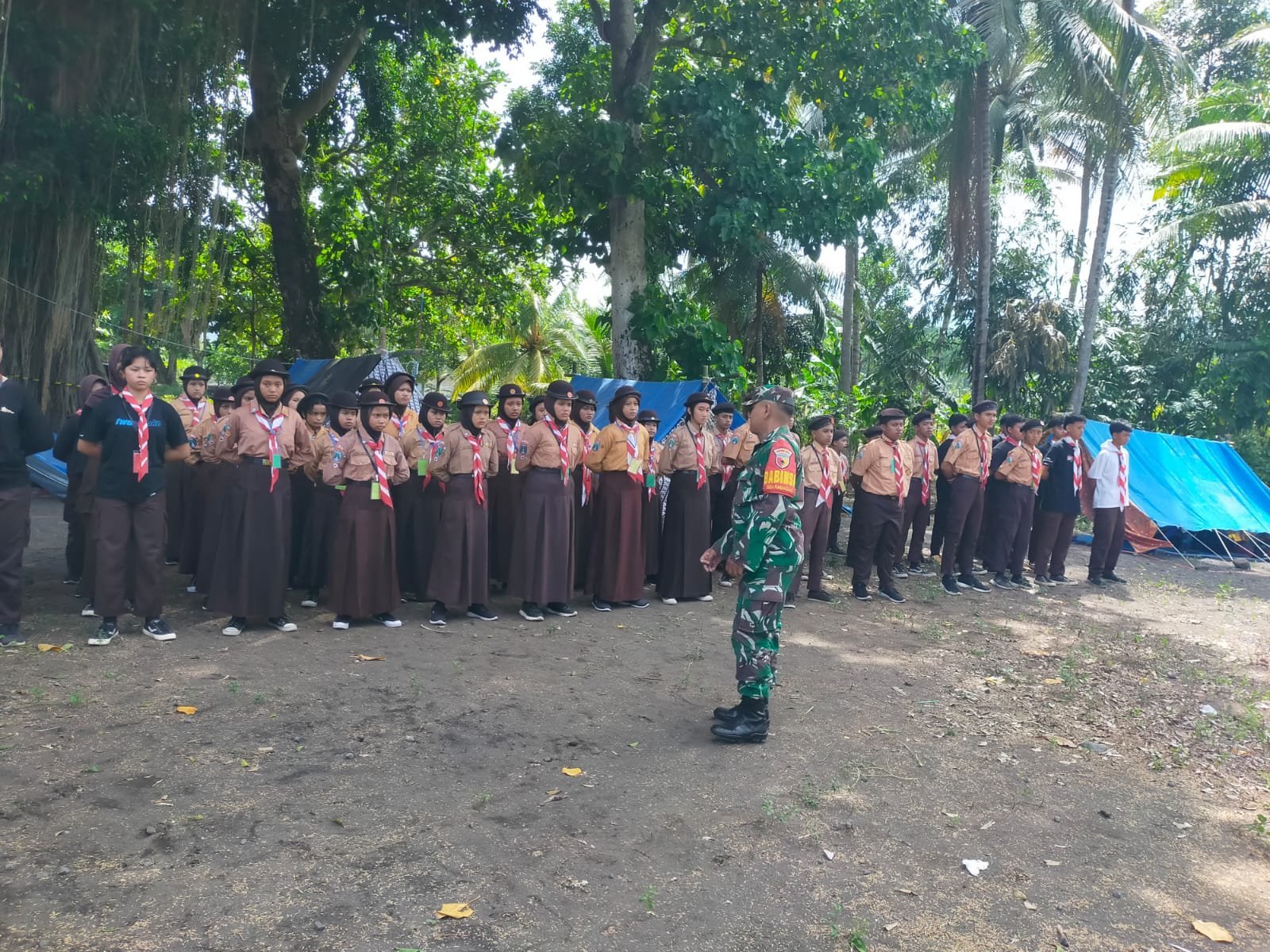 Lumajang, Dalam rangka menanamkan nilai-nilai kebangsaan dan semangat bela negara, Babinsa Tegalrejo Koramil 0821-18/Tempursari, Serka Fery Dian Prasetiyono, memberikan materi wawasan kebangsaan dan bela negara kepada anggota Pramuka Saka Wira Kartika, dalam Perkemahan Sabtu Malam Minggu (Persami) di Pantai Bulu, Dusun Tegalsari, Desa Tegalrejo, Kecamatan Tempursari, Kabupaten Lumajang, Jawa Timur, pada Minggu (16/2/2025).
