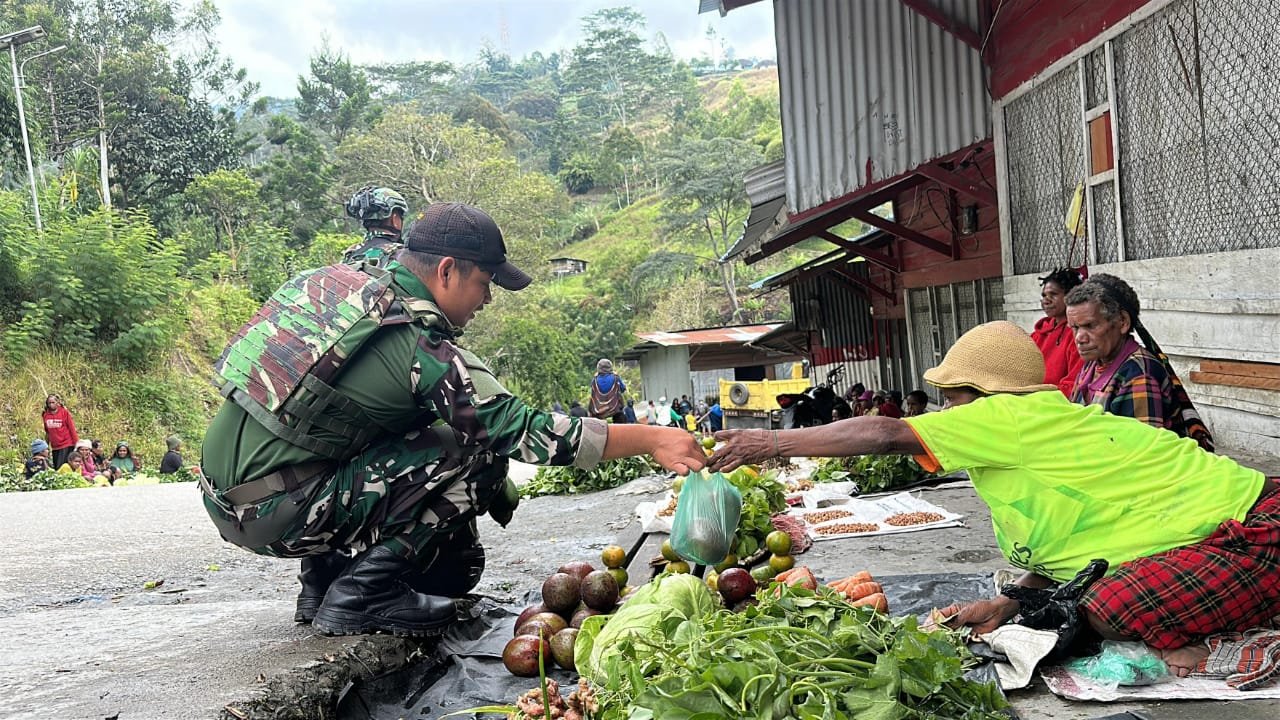 TOLIKARA – Dalam upaya meningkatkan kesejahteraan masyarakat dan mempererat hubungan TNI dengan Rakyat, Satgas Yonif 614/RJP Pos Karubaga yang dipimpin oleh Sertu Syahrul Ramadhan bersama beberapa personel Pos Karubaga melakukan aksi memborong hasil bumi di Pasar Tradisional Jln. Irian Desa Danggulurik, Distrik Karubaga, Kabupaten Tolikara, Papua Pegunungan, Sabtu (05/7/2025).