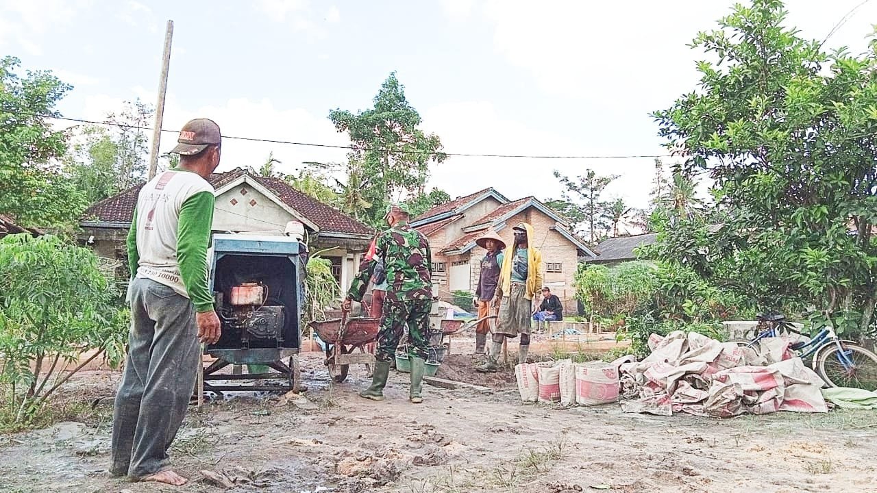 Mengusung semangat gotong royong, Babinsa Koramil 426-03 Rawajitu Serka Lilik, bersama warga bahu membahu melaksanakan pengecoran jalan SK 15 di Desa Sidang Bandar Anom untuk usaha tani.