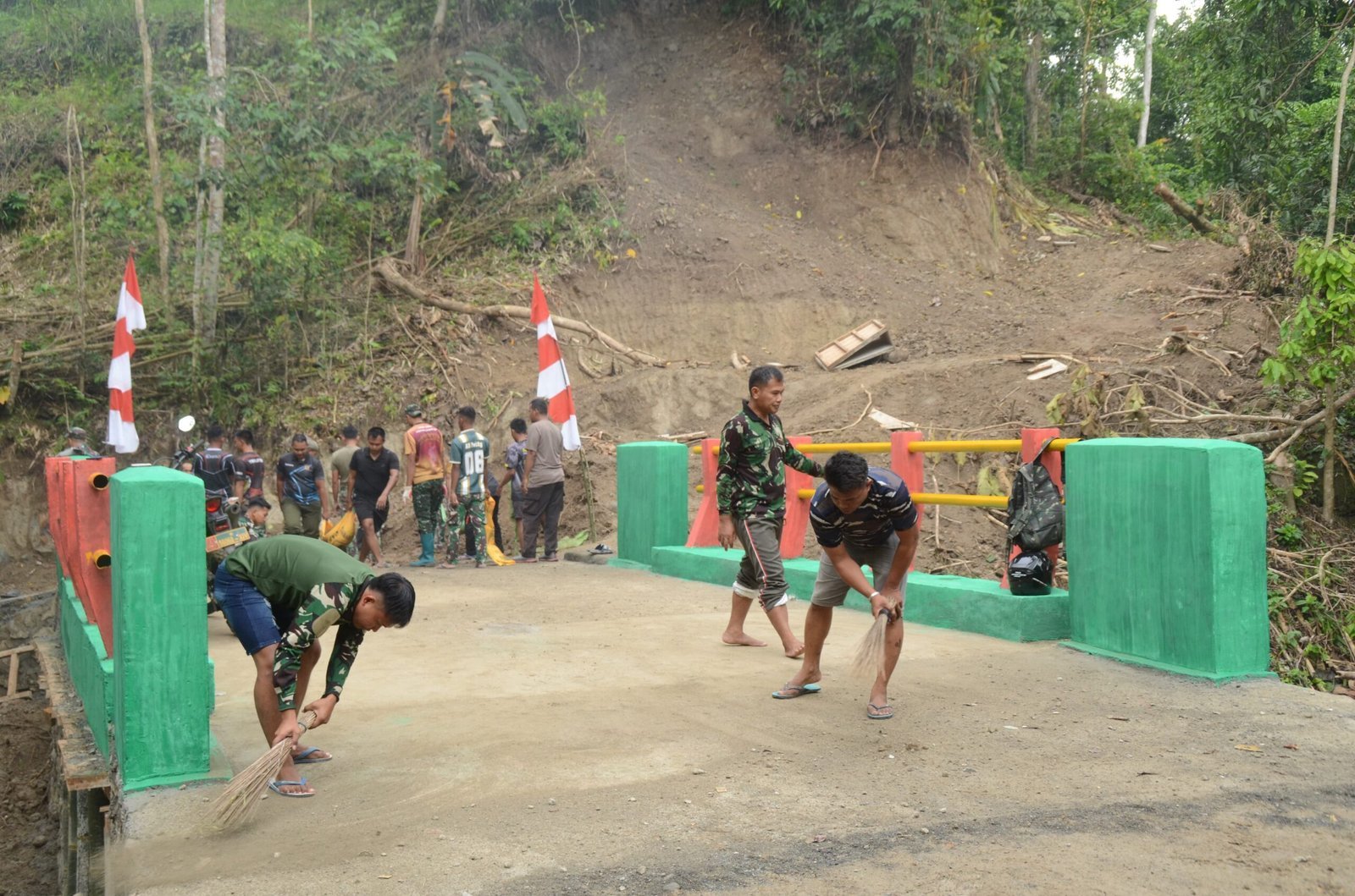 SINJAI. Menjelang berakhirnya program TNI Manunggal Membangun Desa (TMMD) ke-123, Satuan Tugas (Satgas) Kodim 1424/Sinjai melaksanakan pembersihan jembatan yang baru saja selesai dibangun di Desa Lamatti Riawang, Kecamatan Bulupoddo, Kabupaten Sinjai. Dengan menggunakan sapu lidi, anggota Satgas bersama masyarakat setempat membersihkan area jembatan dari sisa-sisa material dan kotoran, memastikan fasilitas tersebut siap digunakan dengan optimal, Rabu (19/3/2025).