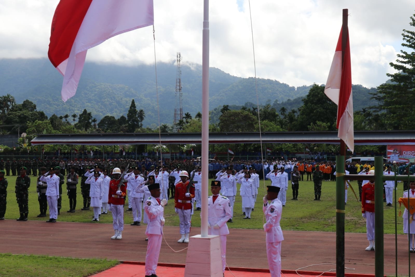 Prosesi semakin khidmat saat Sila Ulvia Silva Kurni, salah satu putri terbaik Yapen, dengan langkah tegap dan penuh keyakinan naik ke panggung kehormatan untuk menerima Duplikat Bendera Pusaka Merah Putih dari Inspektur Upacara. Selanjutnya, tiga putra terbaik Yapen yaitu Norman Josman Nanlohy, Marchel Nuhum J. Ayomi, dan Edison Sergius Barangkea sukses mengibarkan Sang Saka Merah Putih dengan sempurna, diiringi lantunan lagu kebangsaan Indonesia Raya yang menggema di seluruh stadion.