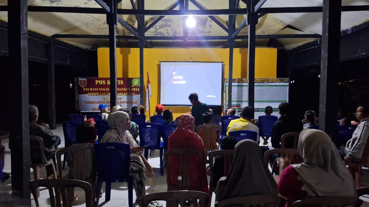 Konawe – Dalam rangkaian kegiatan TNI Manunggal Membangun Desa (TMMD) ke-125, Satgas Kodim 1417/Kendari mengajak warga Desa Awua Jaya, Kecamatan Asinua, Kabupaten Konawe, untuk bersama-sama menyaksikan film perjuangan di Balai Desa, Rabu (20/8).