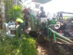 Babinsa Koramil 08/Arongan Lambalek Bantu Petani Desa Ujung Simpang Panen Padi Menggunakan Mesin Combine Harvester