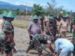 FAKFAK – Korem 182/JO, Mayor Arh Budi Santoso memimpin kegiatan pembuatan bedengan untuk mempercepat perkembangan pengolahan lahan kosong di area Perumahan Dinas