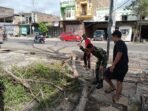 SIDRAP- Babinsa Koramil 1420-05/Dua Pitue Serma Afsalul Rahman bersama warga melaksanakan gotong royong membersihkan ranting pohon yang roboh dan menghalangi pengguna jalan