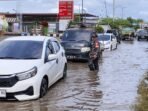 Maros,–Babinsa Desa Moncongloe, Sertu Muh. Yusuf, turun langsung memantau kondisi jalan Poros Moncongloe-BTP yang tergenang air setinggi lutut orang dewasa pada Sabtu