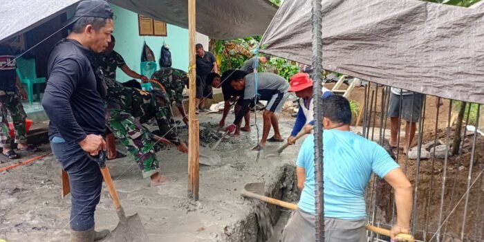 Aceh Jaya – Babinsa Koramil 0114-05/Panga Praka Faisal melaksanakan Karya Bakti pemasangan batako rumah warga binaan milik bapak Muklis di Desa Ladang