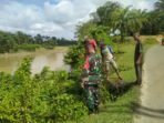 ACEH BARAT – Babinsa Koramil 08 Arongan Lambalek Kodim 0105/Aceh Barat, Sertu Agus, bersama warga desa binaan melaksanakan kegiatan gotong royong membersihkan