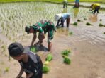 NTB -Dompu. Babinsa Koramil 02/Kempo Kodim 1614/Dompu, Kopda Julkarnain melaksanakan pendampingan menanam padi, di Desa Kempo Kecamatan Kempo, Kabupaten Dompu, Senin (30/12/2024).