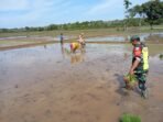 ACEH BARAT – Babinsa Posramil 06/Bubon, Kodim 0105/Aceh Barat Sertu Anang Sukamto turun langsung ke sawah membantu petani desa binaan menanam padi