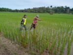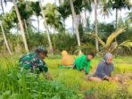 ACEH BARAT – Babinsa Koramil 0105-10 Woyla Barat Kopka Roni Gunawan membantu pemupukan tanaman padi milik Bapak Daud di desa Pasi Mali