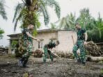 Aceh Jaya – Babinsa Koramil 01/Jaya Koramil 0114/Aceh Jaya Sertu Yulizar bergotong royong bersama warga memasang tenda untuk memperingati Maulid Nabi Muhammad