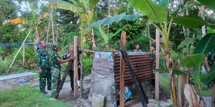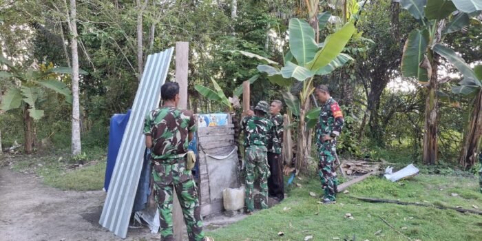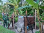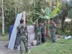 Aceh Jaya – Serda Lukman Babinsa Koramil 02/Sampoiniet Kodim 0114/Aceh Jaya membantu meringankan pekerjaan warga yang sedang merakit kawat untuk tiang beton