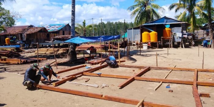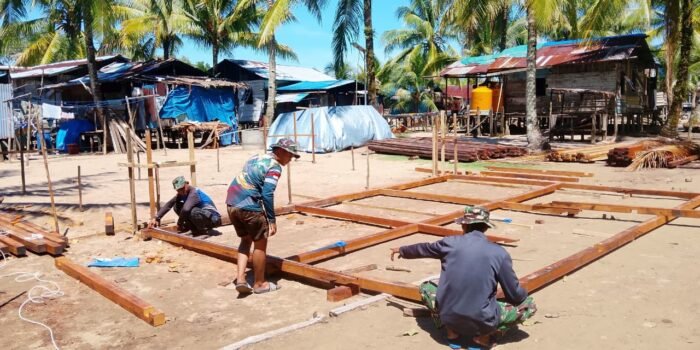 Tolitoli – Anggota Babinsa Koramil 1305-04/Dondo Serda Endri Susanto memantau dan membantu masyarakat pembersihan lantai rumah yang terkena dampak banjir, yang berada