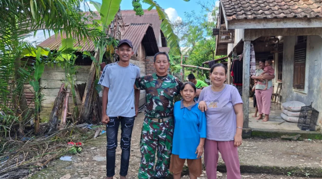 ACEH BARAT – Terciptanya sinergitas TNI bersama rakyat, Babinsa Koramil 10/Woyla Barat Serda Kurniadi membantu warga membangun rumah tgk Herman salah satu