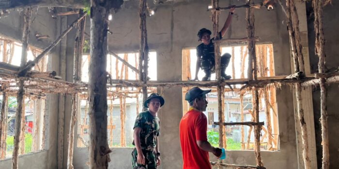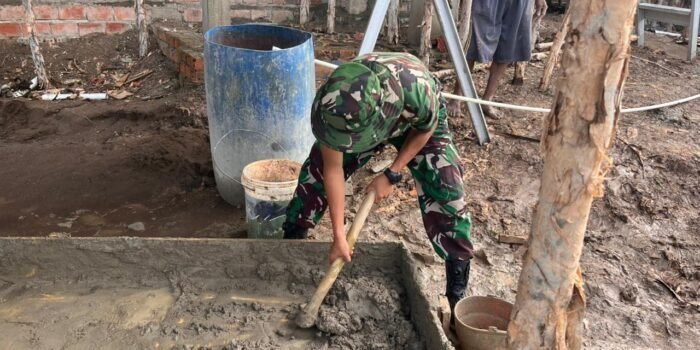 Berjiwa Sosial, Babinsa Bantu Mengaduk Semen Bangun Rumah Warga