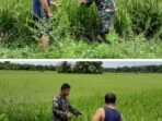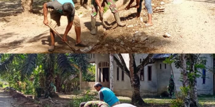 Aceh Jaya – Babinsa Koramil 06/Teunom Kodim 0114/Aceh Jaya Koptu Ardika melaksanakan Kegiatan Karya Bakti (Karbak) bantu mengaduk campuran semen dalam rangka