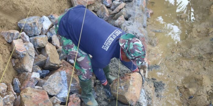 Aceh Jaya – Bintara Pembina Desa (Babinsa) Koramil 01/Jaya Kodim 0114/Aceh Jaya Koptu Aris Kartiko membantu Bapak Abdullah membuat pematang sawah di