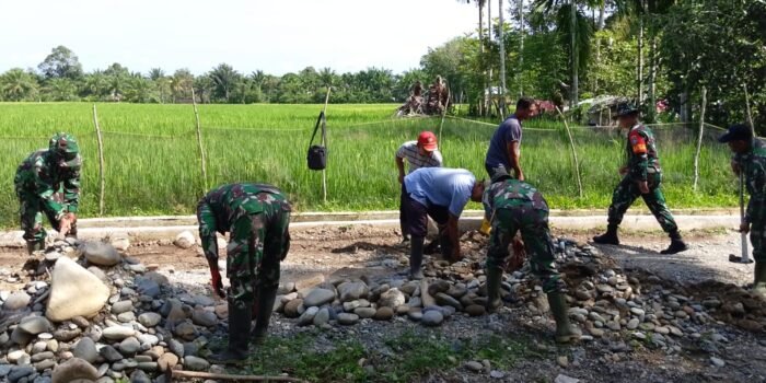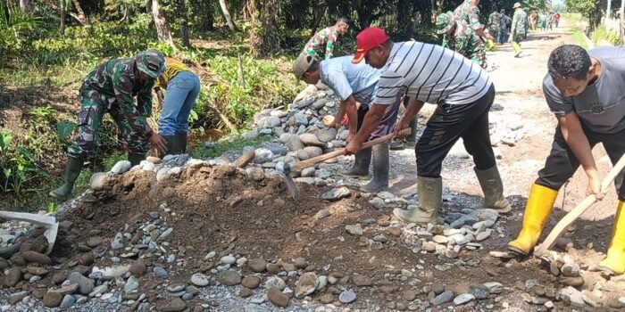 Lombok Timur — Babinsa Kelurahan Sekarteja, Sertu Mohammad Subuh Koramil 1615-01/Selong, bersama Ketua Lingkungan Mekarsari dan masyarakat setempat melaksanakan kegiatan gotong royong,