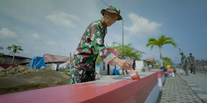 Aceh Jaya – Bintara Pembina Desa (Babinsa) Koramil 01/Jaya Kodim 0114/Aceh Jaya Koptu Aris Kartiko membantu Bapak Abdullah membuat pematang sawah di