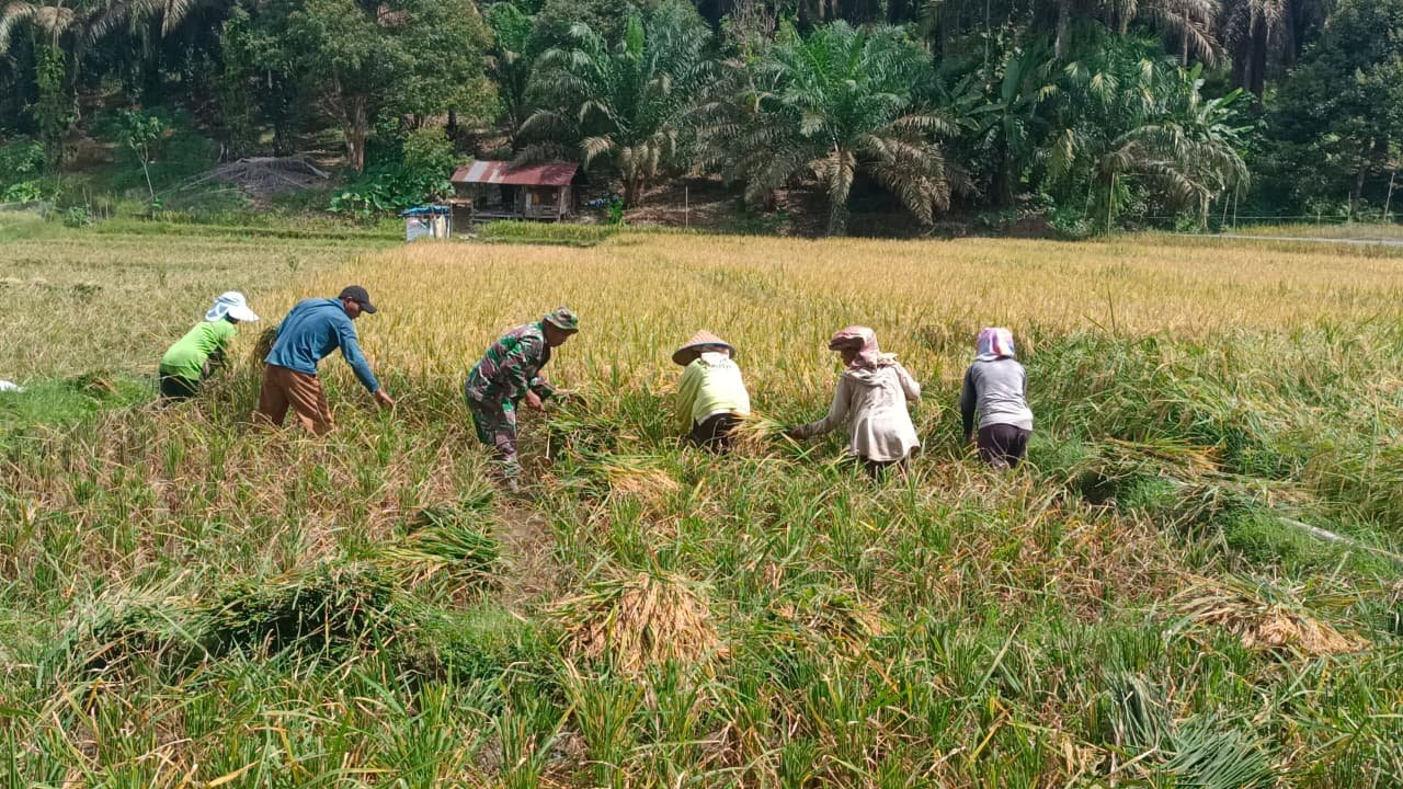 Subulussalam – Dalam upaya mendukung ketahanan pangan di wilayah binaan, Babinsa Posramil Penanggalan Koramil 0118/Subulussalam Korem 012/Teuku Umar turut serta membantu petani melaksanakan panen perdana padi bersama Kelompok Tani Nilam Sada Ari di Desa Penanggalan Barat, Kecamatan Penanggalan, Kota Subulussalam, Sabtu (8/11/2025).