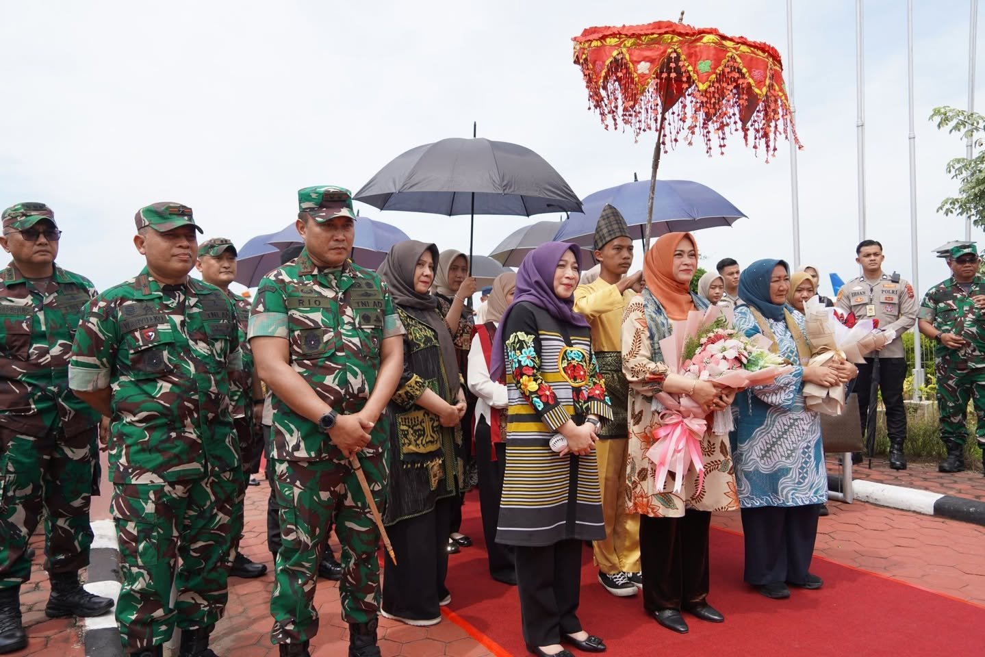 Padang – Panglima Kodam I/Bukit Barisan, Mayor Jenderal TNI Rio Firdianto, didampingi Ketua Persit KCK Daerah I/BB, Ny. Galuh Rio Firdianto, menyambut kedatangan Ketua Umum IKKT Pragati Wira Anggini, Ny. Evi Agus Subiyanto, di Bandara Internasional Minangkabau, Senin (10/2/2025).