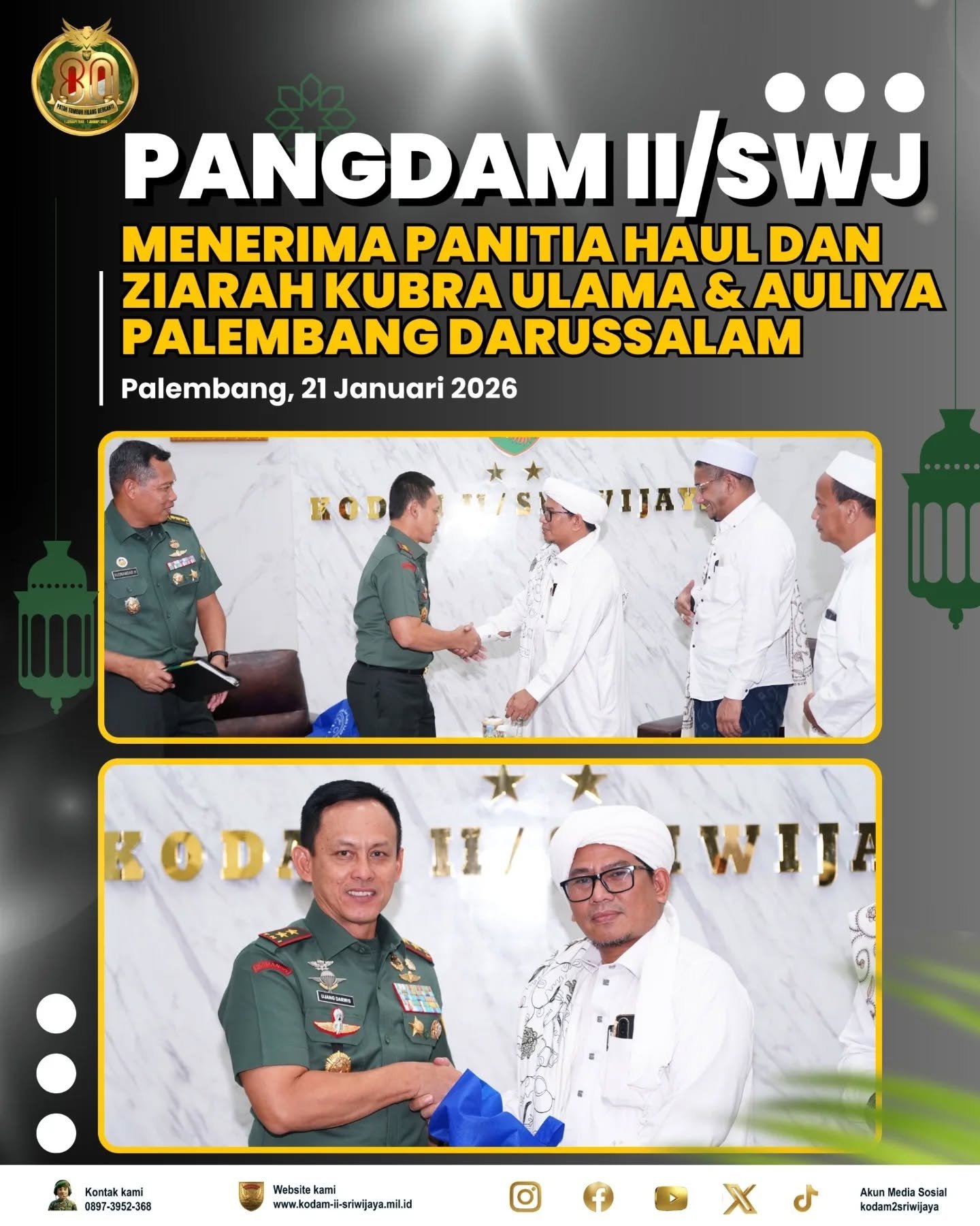 Pangdam II/Sriwijaya, Mayor Jenderal TNI Ujang Darwis, M.D.A., menerima audiensi dari Panitia Haul dan Ziarah Kubra Ulama serta Auliya Palembang Darussalam pada Rabu, 21 Januari 2026. Pertemuan berlangsung di Ruang Audiensi Makodam II/Swj, Palembang dan dihadiri oleh berbagai tokoh penting.