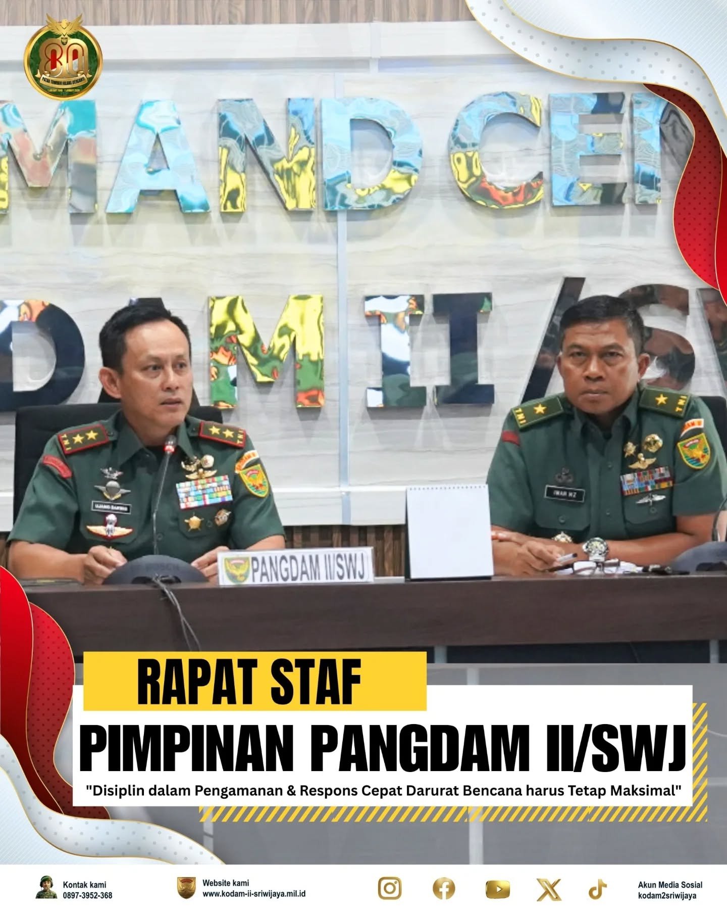 Mayjen TNI Ujang Darwis, Panglima Kodam II/Sriwijaya, memimpin Rapat Staf di Gedung Puskodalopsdam II/Sriwijaya, Palembang, pada hari Senin, 26 Januari 2026. Rapat ini bertujuan untuk mengingatkan seluruh jajaran TNI di wilayahnya akan pentingnya responsivitas dalam menghadapi perubahan dinamika yang terjadi di lapangan.
