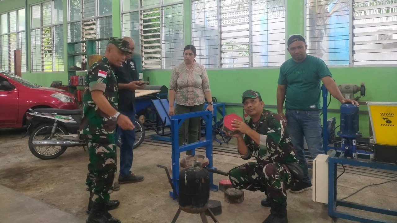 NTT – Kupang – Pasi Ter Kodim 1604/Kupang, Kapten Inf Sudirman bersama Peltu Wayan, melakukan peninjauan terhadap alat daur ulang sampah plastik menjadi paving block di Kampus Politeknik Negeri Kupang. Kegiatan ini merupakan bagian dari upaya mendukung inovasi dalam pengelolaan sampah plastik yang ramah lingkungan dan berkelanjutan. Peninjauan berlangsung pada hari Selasa, 16 Januari 2025, di Kampus Politeknik Negeri Kupang yang terletak di Jalan Prof. Dr. Herman Johanes, Kelurahan Lasiana, Kecamatan Kelapa Lima, Kota Kupang. Rabu (15/01/2025).