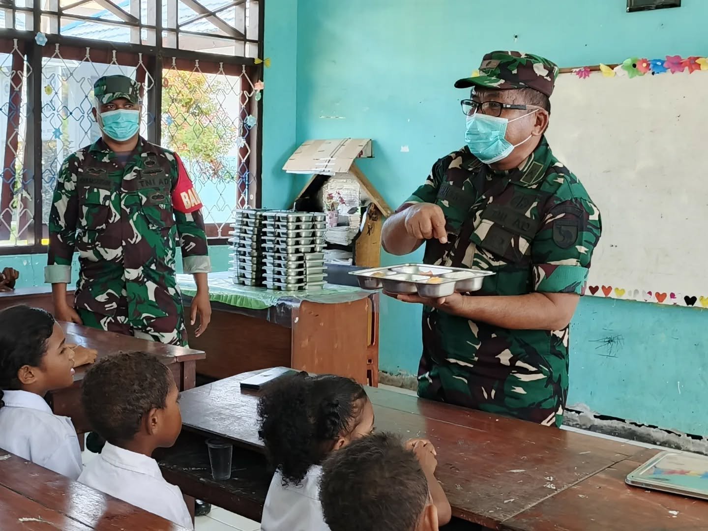 Babinsa Serma Boas Bolang bersama para Babinsa lainnya, selama dalam kegiatan ujicoba distribusi MBG yang telah dilakukan beberapa hari ini, salah satu sekolah yang menjadi sasaran uji coba yaitu di SD Inpres Ayambori Distrik Manokwari Timur, SMP Don Bosco, SD YPK 14, SD YPK 04, TK Kartika dan TK Pertiwi.