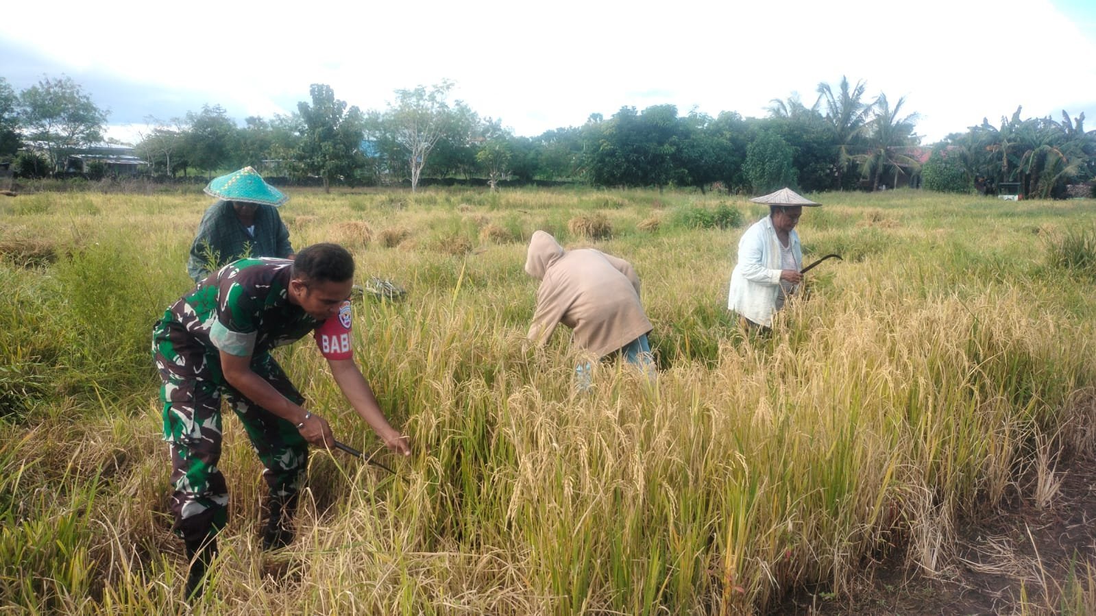 NTT Rote Ndao Babinsa Koramil 03/Batutua Kodim 1627/Rote Ndao, Serda Demsi Taek melaksanakan pendampingan kepada petani saat memanen padi di persawahan Oeoko Desa Modosinal, Kecamatan Rote Barat Laut Kabupaten Rote Ndao.