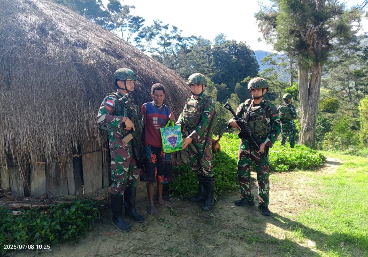 LANNY JAYA – Satgas Yonif 614/RJP melaksanakan Anjangsana dan memberikan paket sembako kepada warga di Desa Tima, Distrik Balingga, Kabupaten Lanny Jaya, Papua Pegunungan, Selasa (08/7/2025).