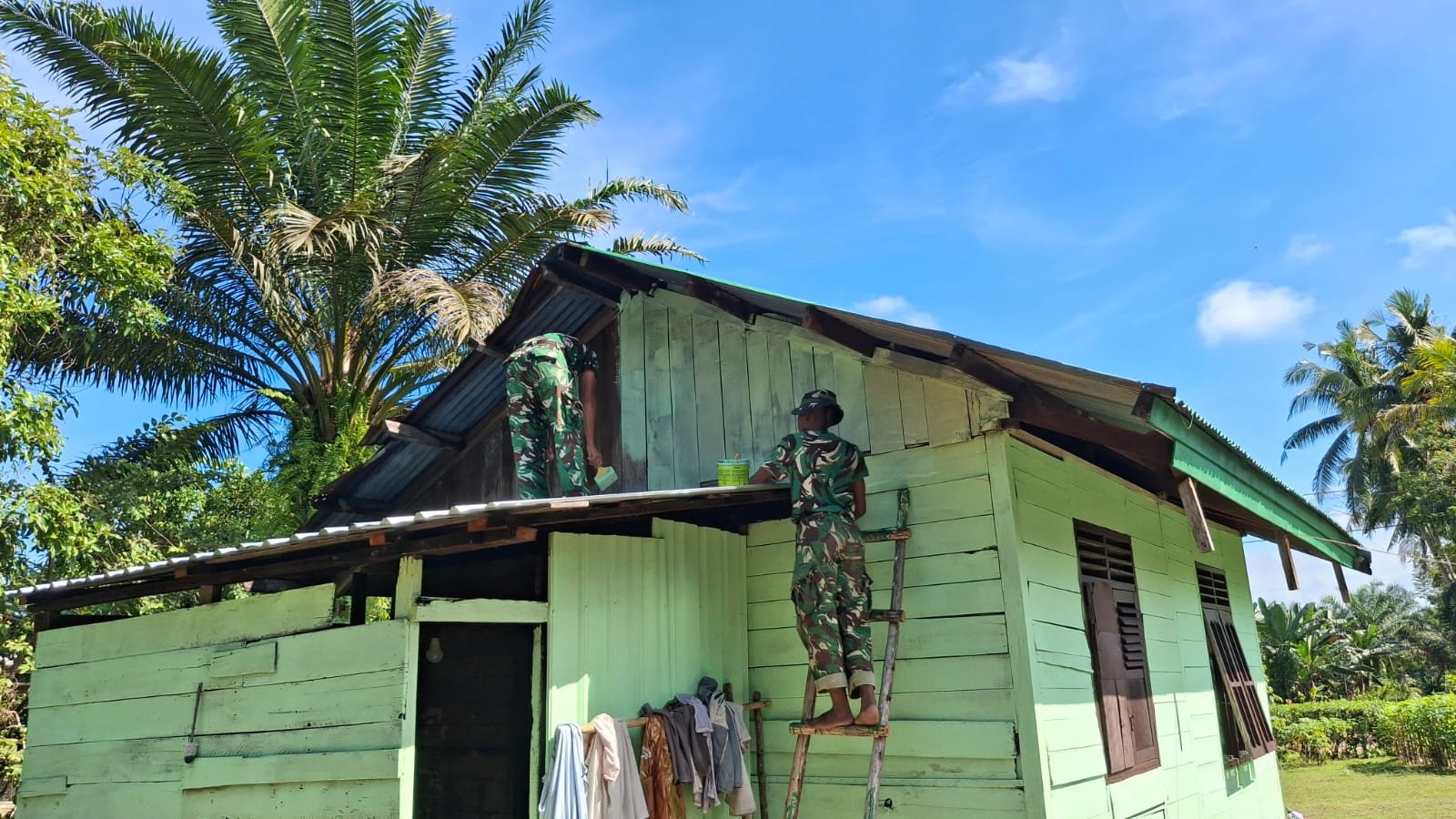 Pangkalan Banteng – Progres dari Program TMMD Ke-128 Kodim 1014/Pbn yang berlangsung di Desa Sungai Hijau, Kecamatan Pangkalan Banteng terus menunjukkan kemajuan yang berarti. Pada hari Kamis, 30 April 2026, proses pengecatan dinding rumah milik Bapak Bari telah memasuki tahap akhir yang dikenal sebagai finishing.