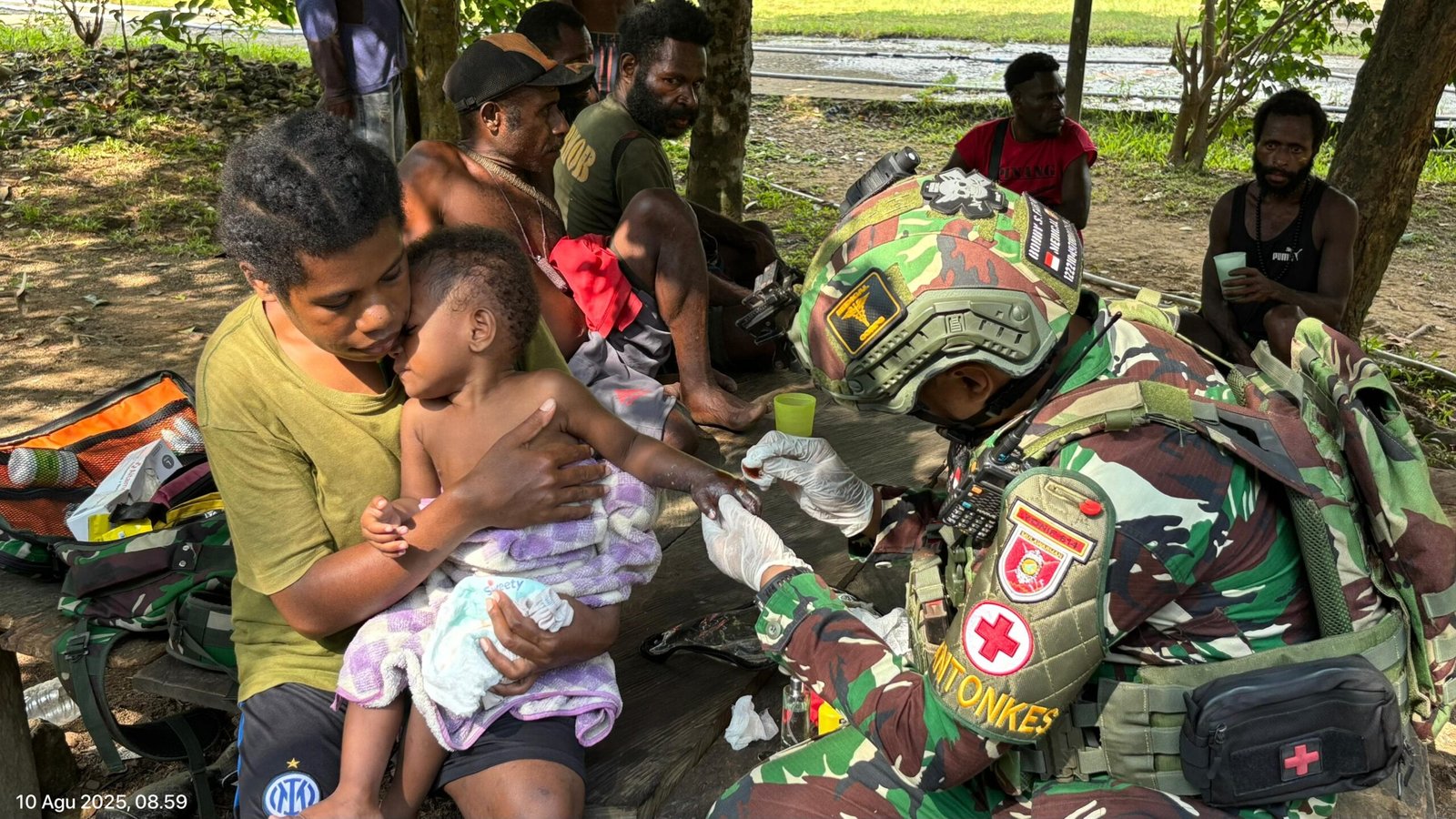 TOLIKARA – Wujud kepedulian terhadap kesehatan masyarakat Papua, Satgas Yonif 614/RJP Pos Dabra melaksanakan pelayanan kesehatan (Yankes) gratis di Desa Dabra, Distrik Memberamo Hulu, Kabupaten Memberamo Raya, Papua. Minggu (10/8/2025).