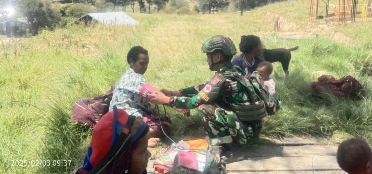 LANNY JAYA – Bintara Kesehatan (Bakes) Satgas Yonif 614/RJP Pos Tima terus memberikan pelayanan kesehatan secara gratis kepada masyarakat yang berada di Kampung Tima, Distrik Balingga, Kabupaten Lanny Jaya, Papua Pegunungan, Senin (03/2/2025).