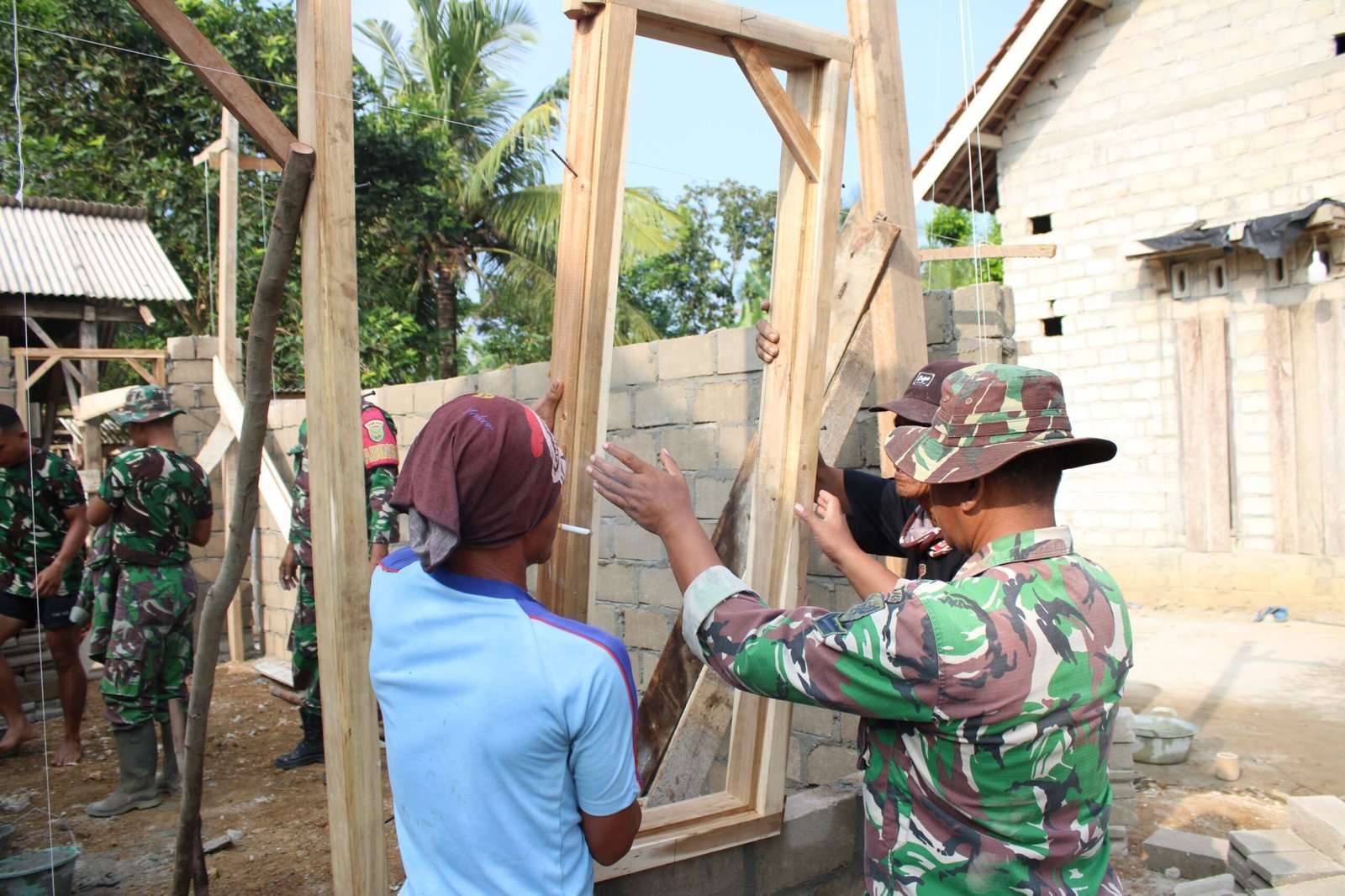 Satgas TMMD tampak teliti dalam mengukur dan menyesuaikan posisi kusen dengan bukaan jendela yang telah disiapkan. Setiap kusen dipastikan terpasang dengan kokoh dan presisi agar memudahkan saat pemasangan kaca atau daun jendela nantinya.