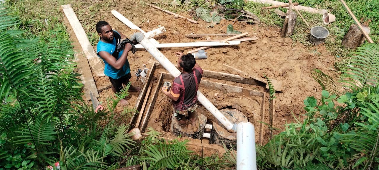 Pemasangan pipa dilakukan secara manual dengan menggali saluran pembuangan di area yang dikelilingi rerumputan dan pepohonan. Dua personel Satgas bersama warga tampak bahu-membahu menata jalur pipa dengan teliti agar saluran air limbah berfungsi sesuai standar sanitasi. Proses ini juga melibatkan pengukuran kemiringan tanah agar aliran pembuangan berjalan lancar.