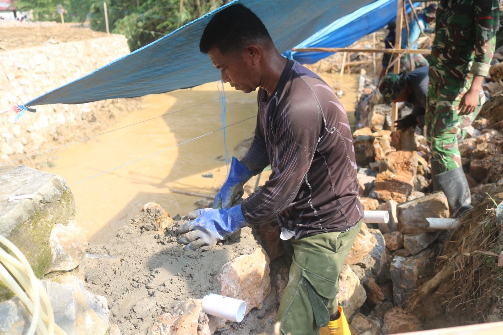 Kendari – Dalam rangka memperkuat sistem drainase di lingkungan sekitar, personel Satgas TMMD ke-127 dari Kodim 1417/Kendari melaksanakan pemasangan pipa pembuangan air pada dinding talud di Kelurahan Anggoeya, Kecamatan Poasia, pada Selasa (17/2). Kegiatan ini merupakan bagian dari upaya untuk memastikan aliran air berjalan lancar dan mengurangi tekanan air pada struktur dinding penahan tanah.
