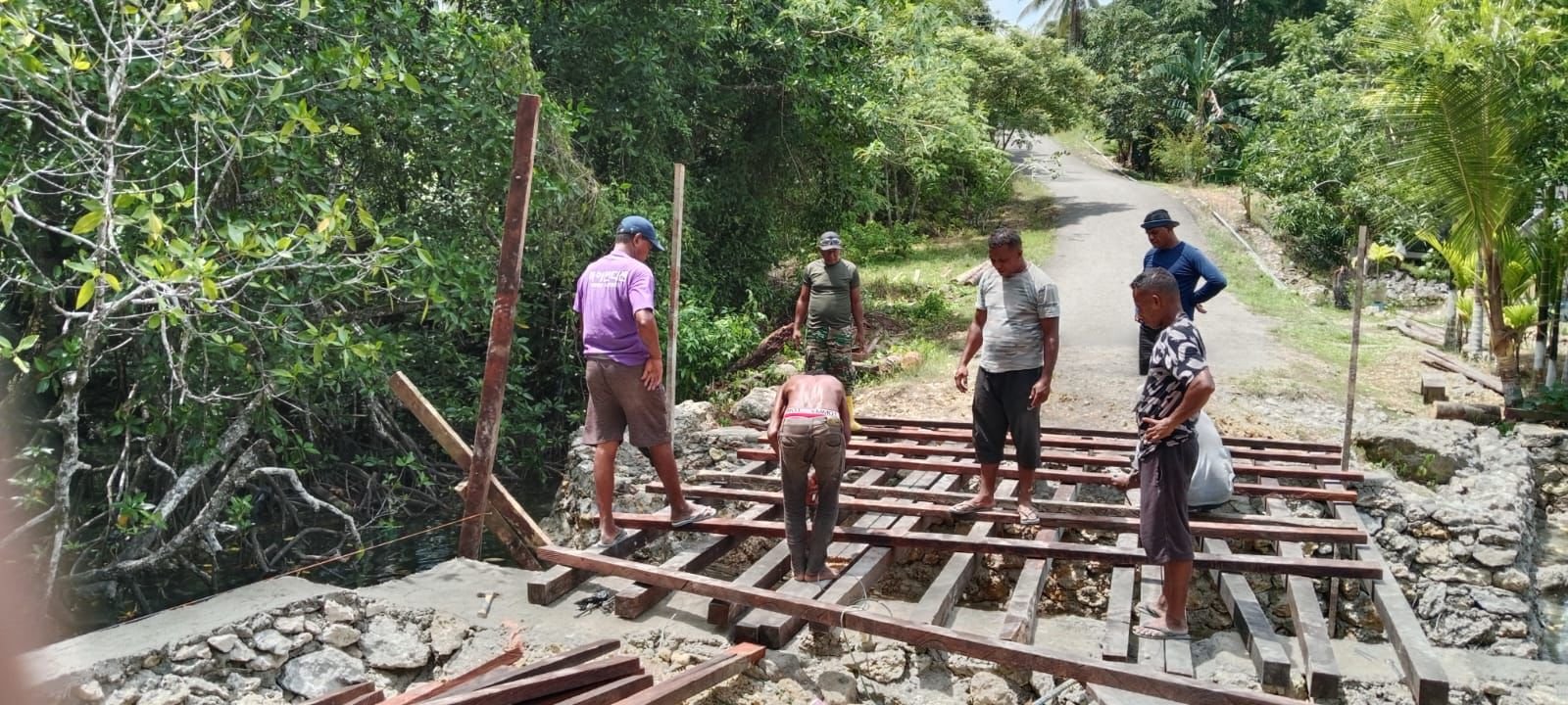 Pemasangan balok dan kayu ini merupakan tahapan penting karena berfungsi sebagai kerangka penopang utama sebelum jembatan bisa digunakan. Ketelitian serta kerjasama tim di lapangan menjadi faktor kunci untuk memastikan bahwa konstruksi tersebut memiliki daya tahan yang baik.