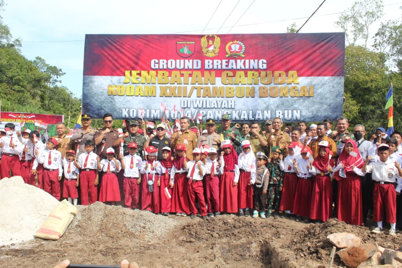 Rangkaian kegiatan dimulai dengan video conference (vicon) bersama Pangdam XXII/Tambun Bungai, diikuti dengan prosesi peletakan batu pertama oleh para undangan sebagai simbol dimulainya pembangunan jembatan.