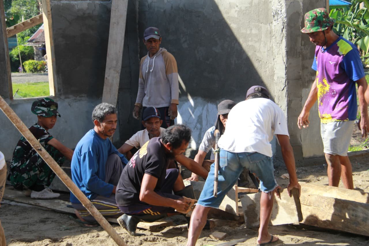 Dalam proses pembangunan, para anggota Satgas TMMD bekerja sama dengan masyarakat setempat dengan semangat gotong royong. Mereka bersama-sama melakukan berbagai tahapan pekerjaan, mulai dari penyiapan material hingga konstruksi bangunan, sebagai wujud kemanunggalan TNI dan rakyat.