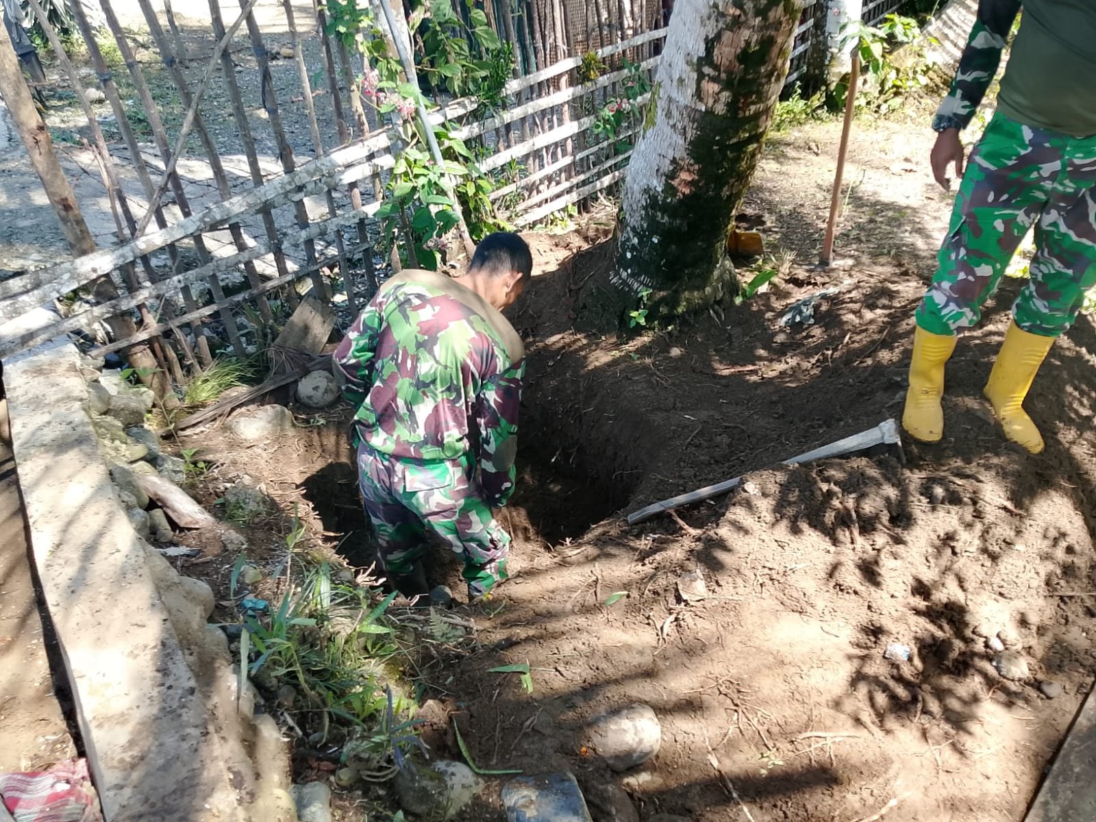 Pelaksanaan pembangunan diawali dengan pembersihan lokasi, penggalian septic tank, dan pembuatan pondasi WC yang dilakukan oleh anggota Satgas TMMD bersama warga setempat.