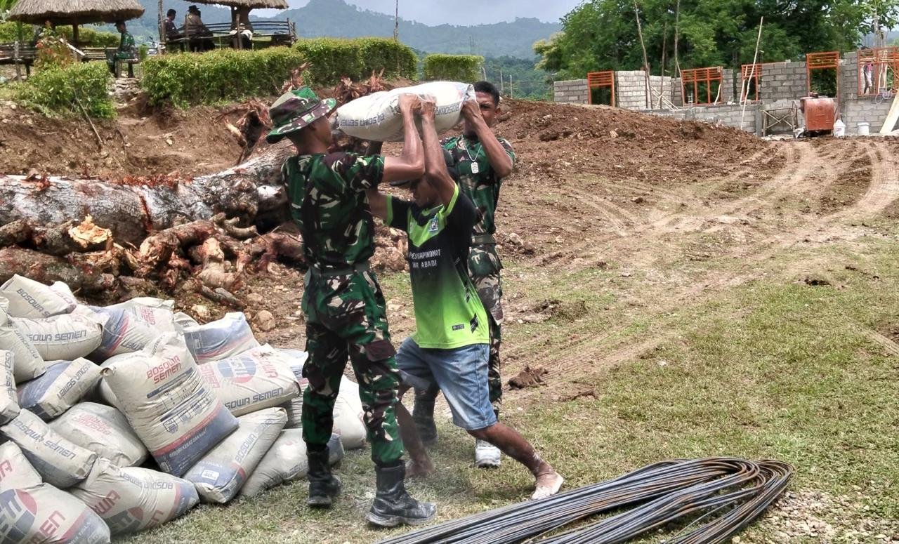 Suasana gotong royong mewarnai kegiatan ini, dengan anggota Satgas yang bekerja sama dengan masyarakat setempat dalam menurunkan dan menata material ke area kerja. Kehadiran Satgas TMMD tidak hanya memberikan kontribusi dalam bentuk fisik, tetapi juga membangun harapan dan kepercayaan masyarakat terhadap masa depan pendidikan anak-anak mereka.