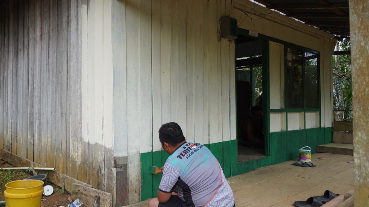 Tim Satgas TMMD telah menyelesaikan berbagai pekerjaan penting, mulai dari pemasangan pintu dan jendela hingga proses akhir pengecatan dinding rumah. Pengecatan dilakukan secara menyeluruh pada dinding, pintu, dan jendela dengan menggunakan warna hijau yang memberikan kesan sejuk dan nyaman.
